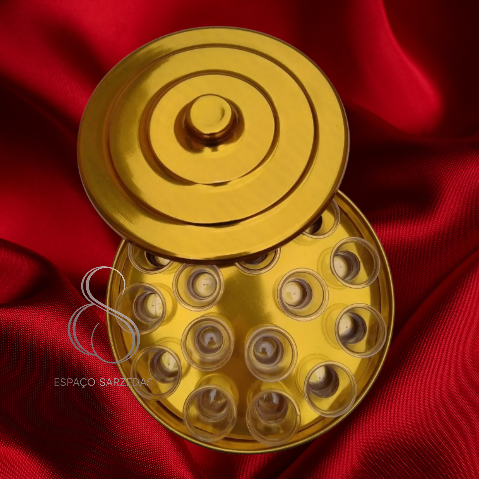 Bandeja de santa-ceia tamanho pequeno fabricada em alumínio anodizado dourado com aro em acrílico transparente com capacidade de16 cálices.