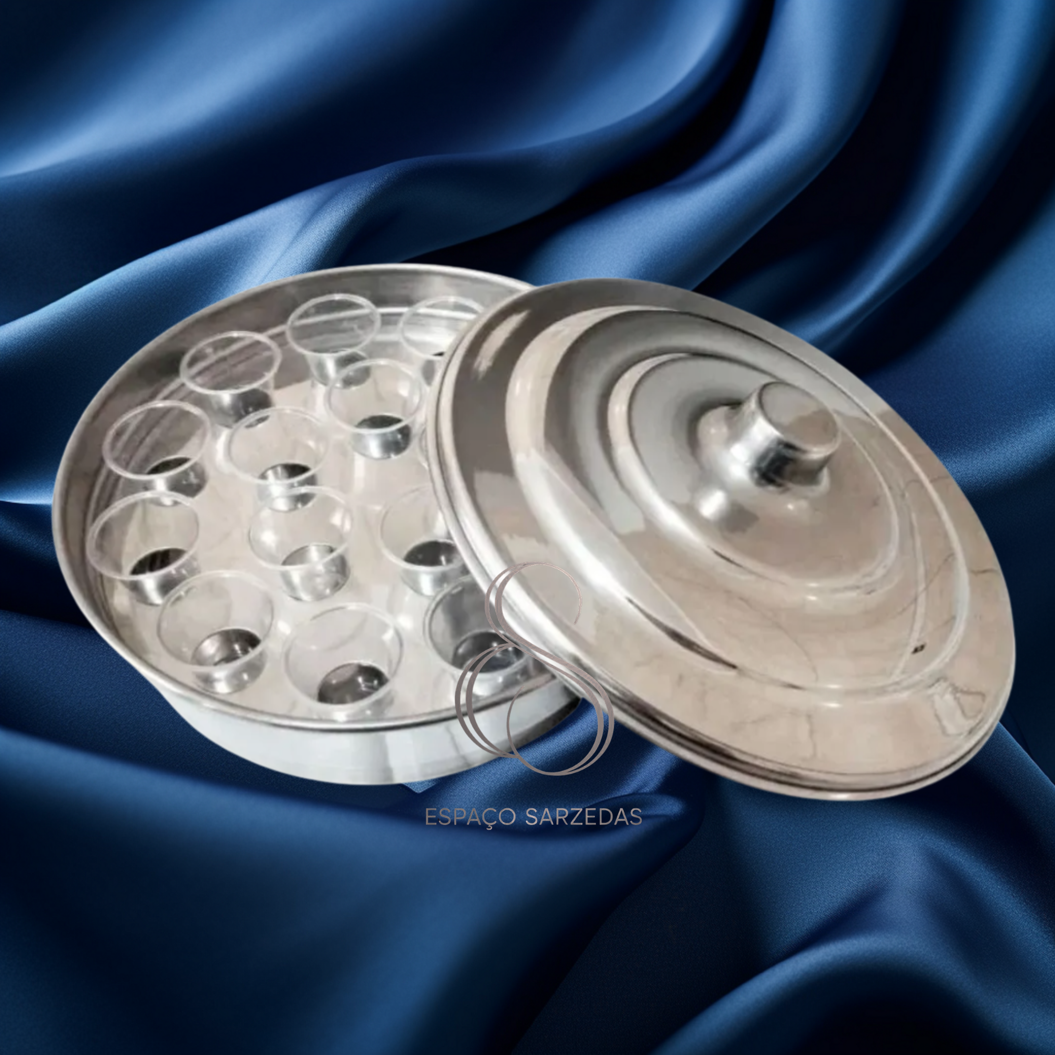 Bandeja de Santa Ceia tamanho pequeno fabricada em alumínio polido com aro em acrílico cinza.