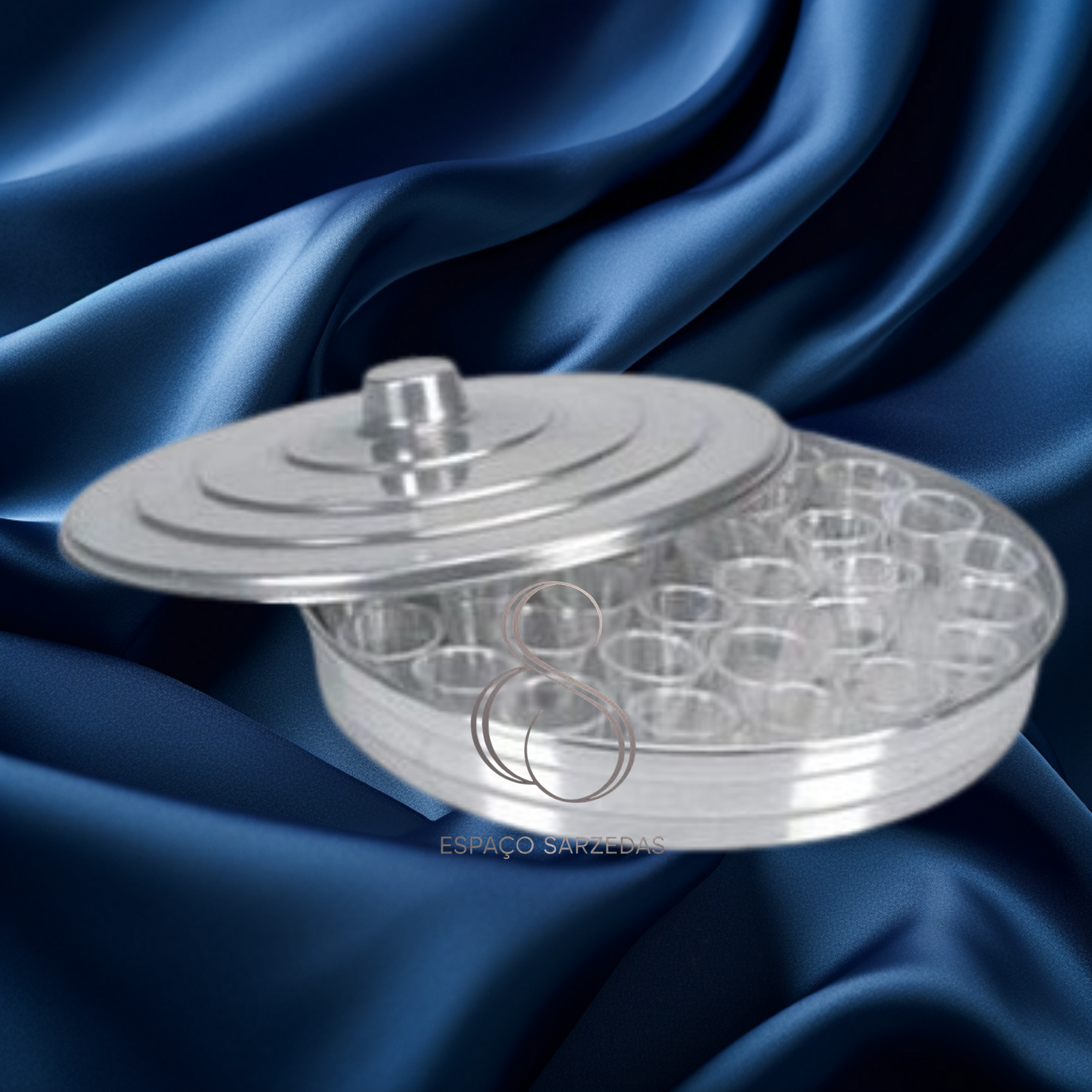 Bandeja de Santa Ceia fabricada em alumínio polido com aro acrílico cinza.